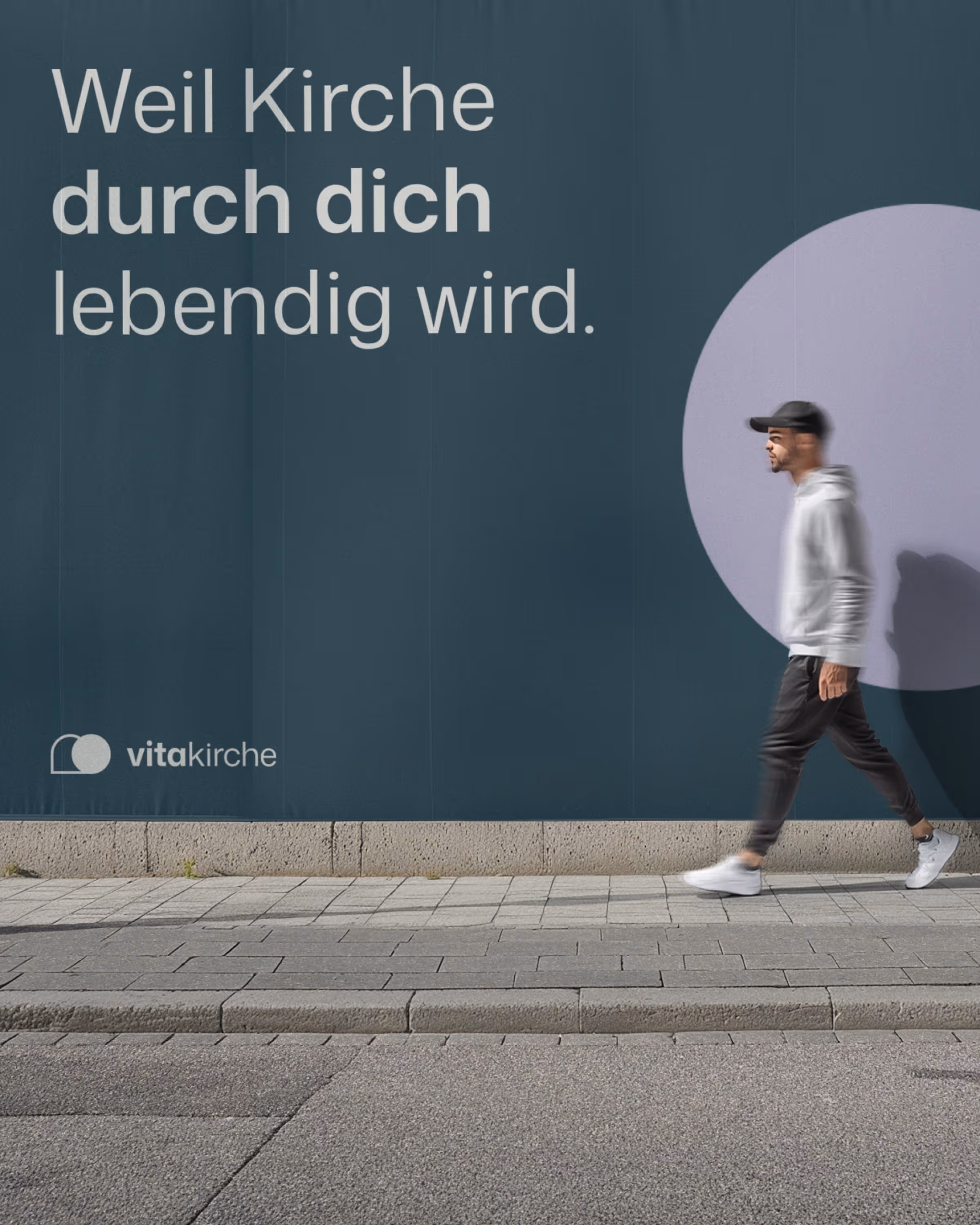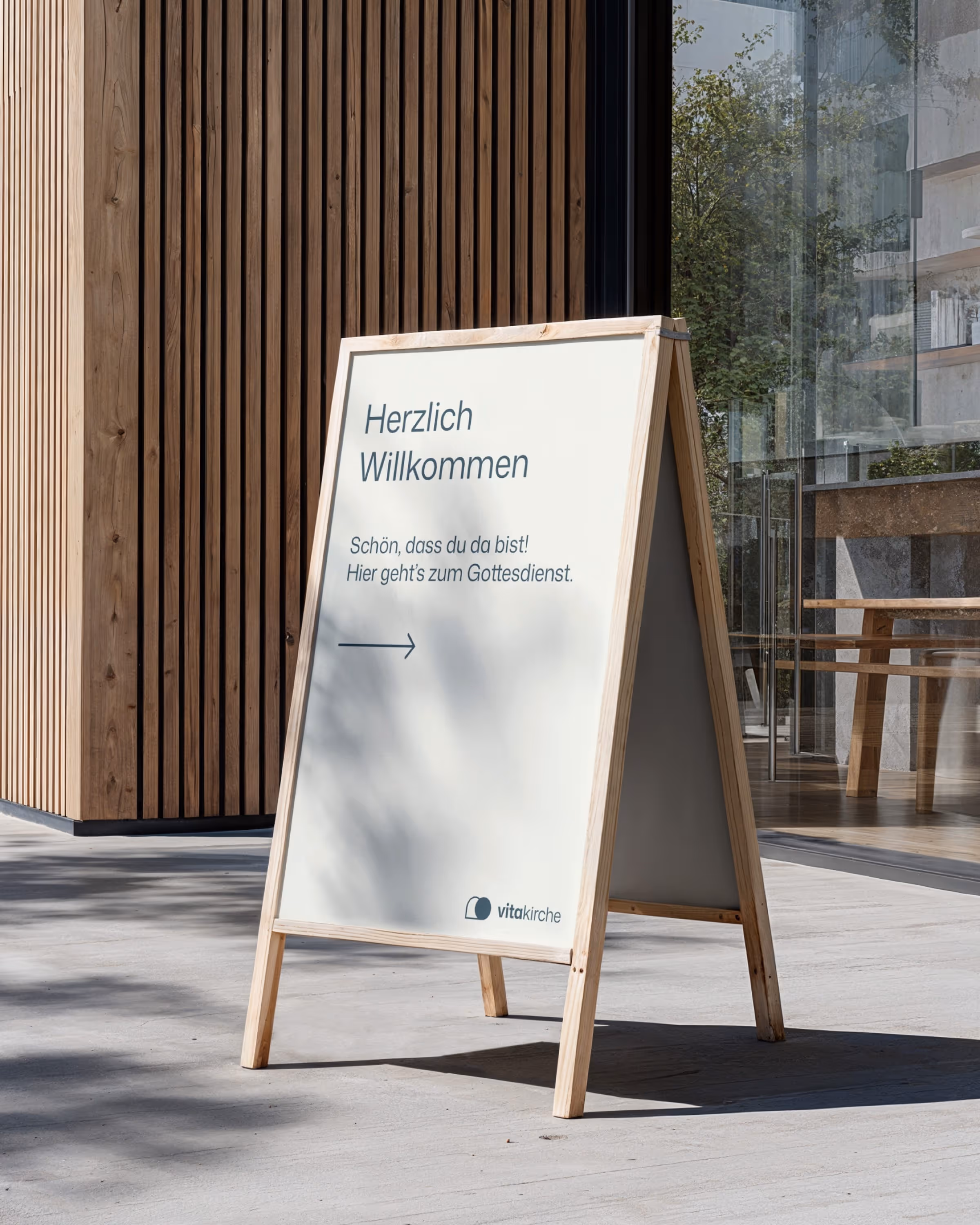 Im Zentrum des Erscheinungsbildes steht eine Bildmarke, die bewusst auf den Auferstehungsbericht aus Markus 16,4 Bezug nimmt: „Doch als sie zum Grab aufblickten, sahen sie, dass der große, schwere Stein schon weggerollt war.“ Die reduzierte Form zeigt den Eingang des Grabes und den zur Seite gerollten Stein. Damit wird der entscheidende Moment der Auferstehung sichtbar – der Übergang vom Tod zum Leben. Genau hier liegt auch die inhaltliche Verbindung zum Namen der Kirche: Vita, das Leben. Die Bildmarke übersetzt diesen Gedanken in ein klares Symbol. Der weggerollte Stein steht für neues Leben, Hoffnung und Aufbruch. Damit trägt das Zeichen nicht nur eine biblische Referenz, sondern formuliert zugleich den Kern der Identität der VitaKirche: eine Kirche, die vom Leben her denkt – und vom Leben erzählt.