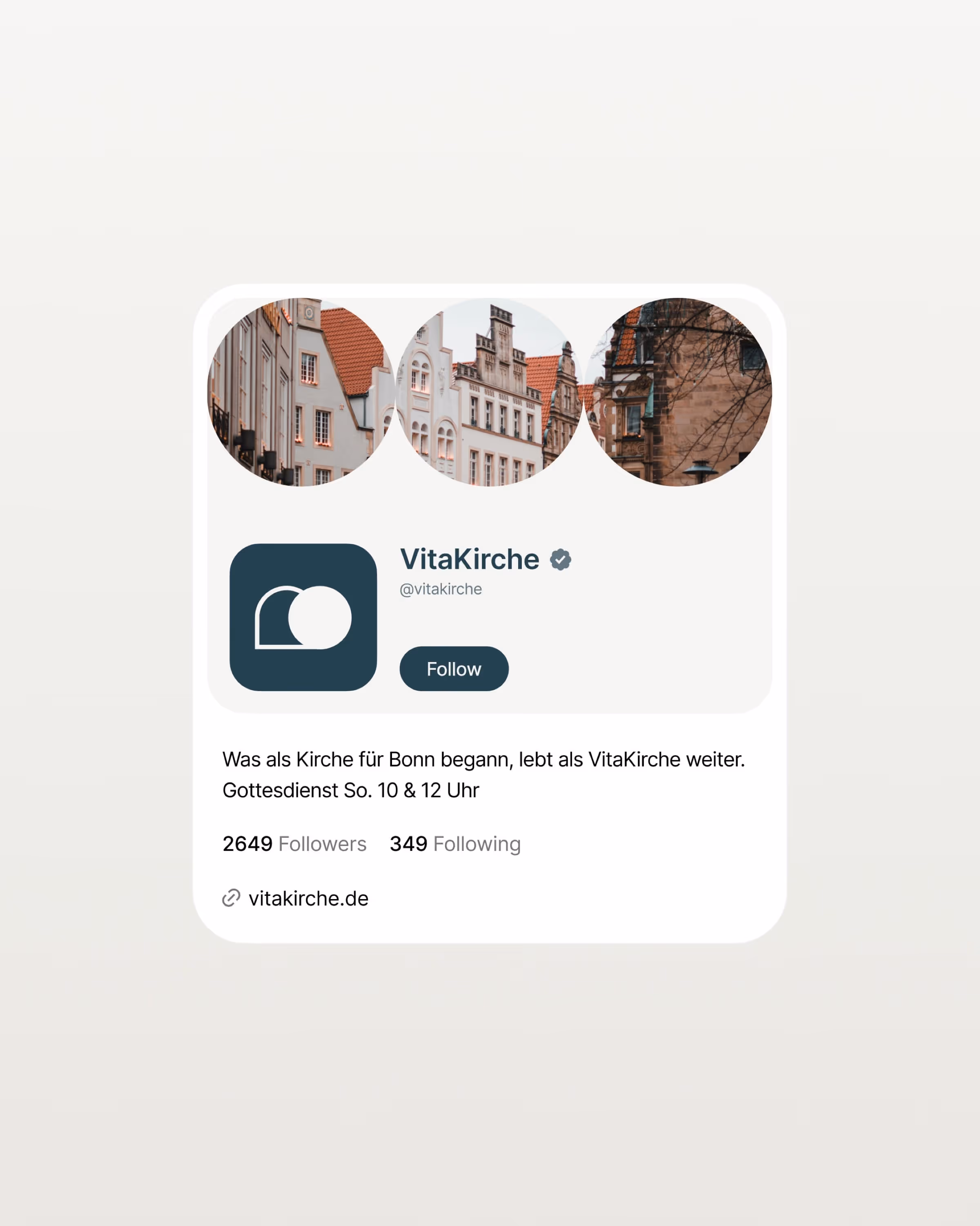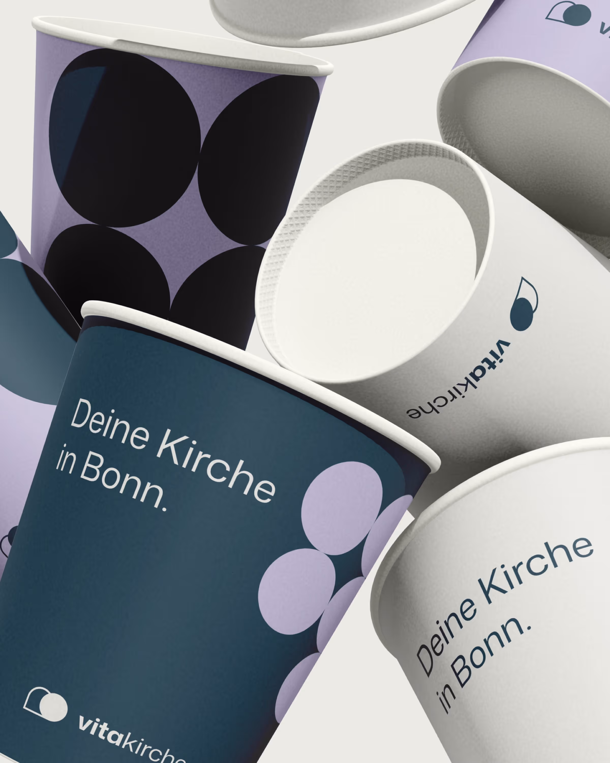 Für die VitaKirche in Bonn entwickelte Creado ein Erscheinungsbild, das Glauben, Gemeinschaft und Aufbruch visuell zusammenführt. Ein reduziertes Zeichen, ein flexibles Farbsystem und eine klare Gestaltung übersetzen die Botschaft der Kirche in eine zeitgemäße, ruhige und zugleich lebendige Form.